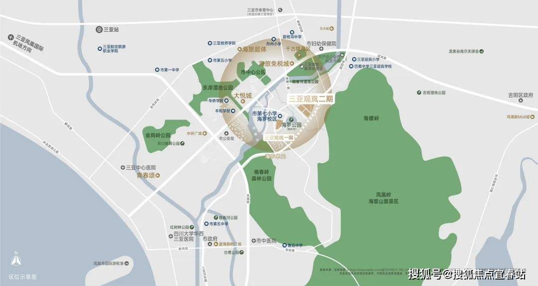 三亚观岚坐落于三亚中央商务区起步区CBD,这里是海南自贸港建设新潮头下,景观与资源集聚的双重高地。项目北临三亚核芯经济走廊迎宾路,南侧紧邻市中心的国家4A级旅游风景区凤凰岭,周边还有临春岭森林公园、东岸湿地公园、临春河等生态资源环绕,是城中央难得的人居高地。