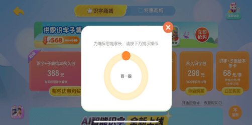 与之形成对比的是,记者点击“商城”按钮,进入了购买会员页面后,随机选择一种会员开通,跳出的验证弹窗,只需拖动圆点按照既有轨迹画出一个圆圈,比此前两个“确保家长操作”的弹窗在操作性上明显更简单。