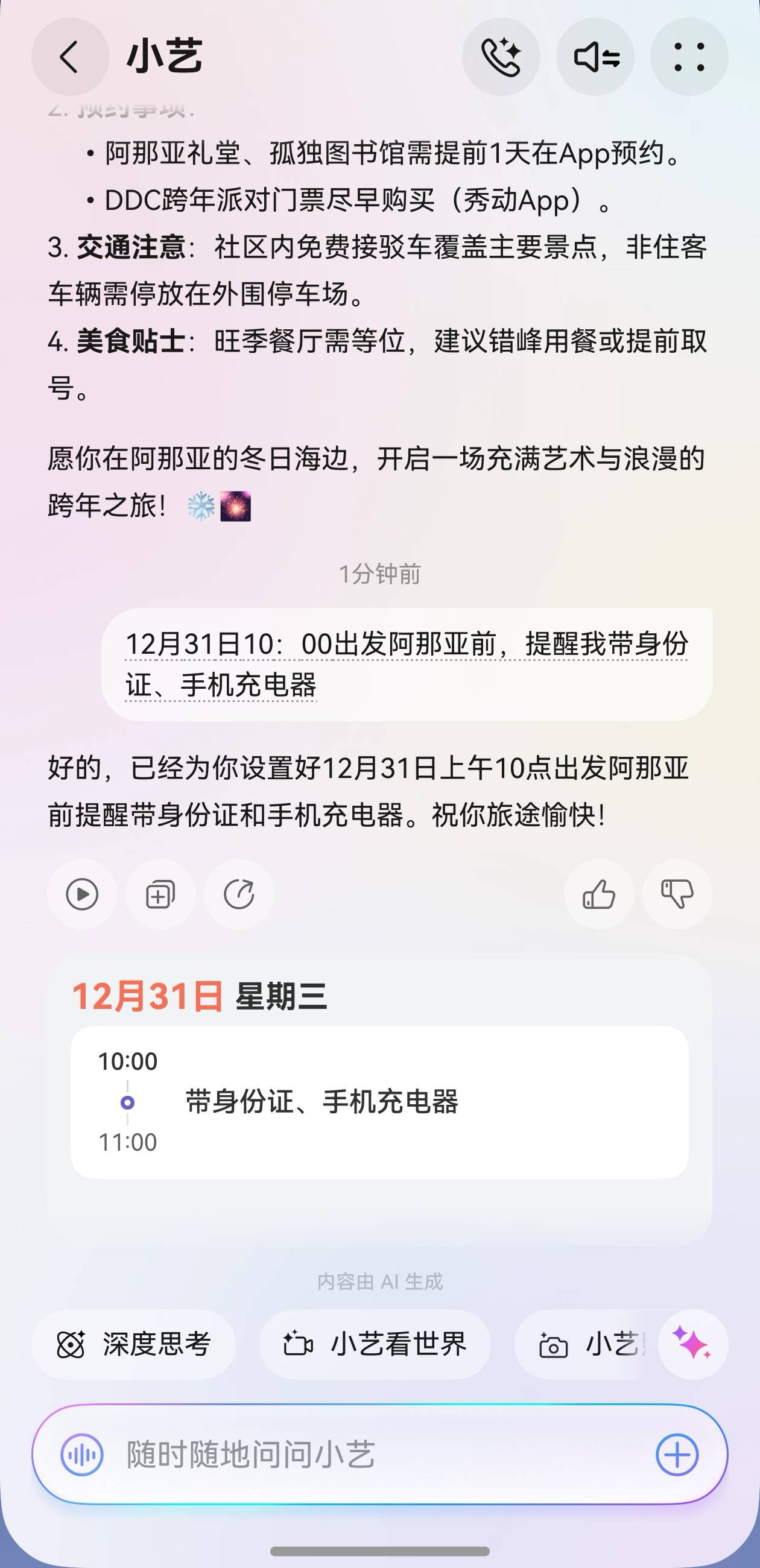 行前准备的细节把控同样关键。担心遗漏随身物品?唤醒小艺设置任务“12月31日出发阿那亚前,提醒我带身份证、手机充电器”,到预定时间后不仅有弹窗提示,连接的华为手表还会同步震动。这种“一句话搞定”的便捷,让行前准备从琐碎负担变为轻松体验。