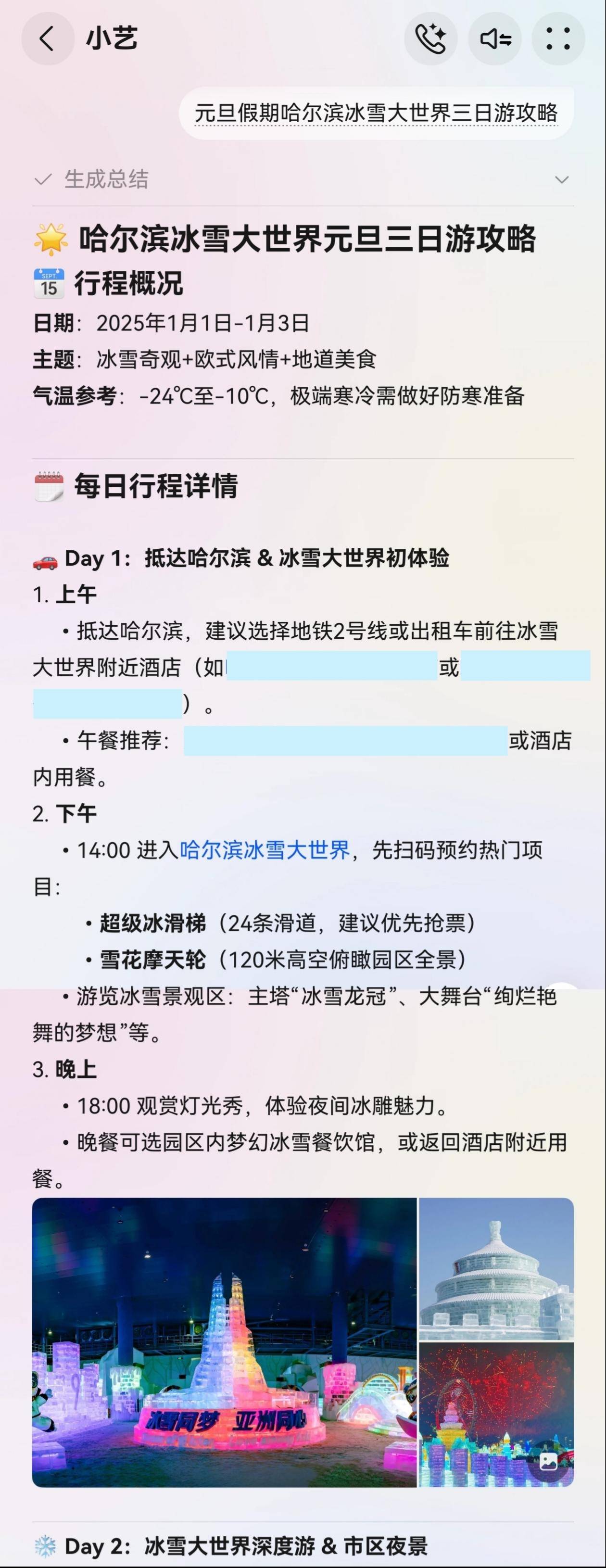 与其在各社交平台漫无目的地刷攻略,不如直接唤醒小艺问一问“元旦假期哈尔滨冰雪大世界三日游攻略”或“上海迪士尼跨年烟花秀攻略”,小艺便能综合景点、交通、美食与实时信息,生成一份图文并茂的个性行程单。行程中感兴趣的地点便可点击后实现服务直达,从而进行导航,让规划变得无比轻松。