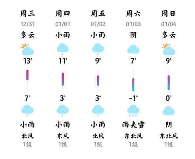 据气象部门初步预测,元旦假期前一天和假日期间,我市以多云及阴天为主,伴有零星小雨,部分山区有小雪天气,气温5~12℃,总体判断适合冬日出游。