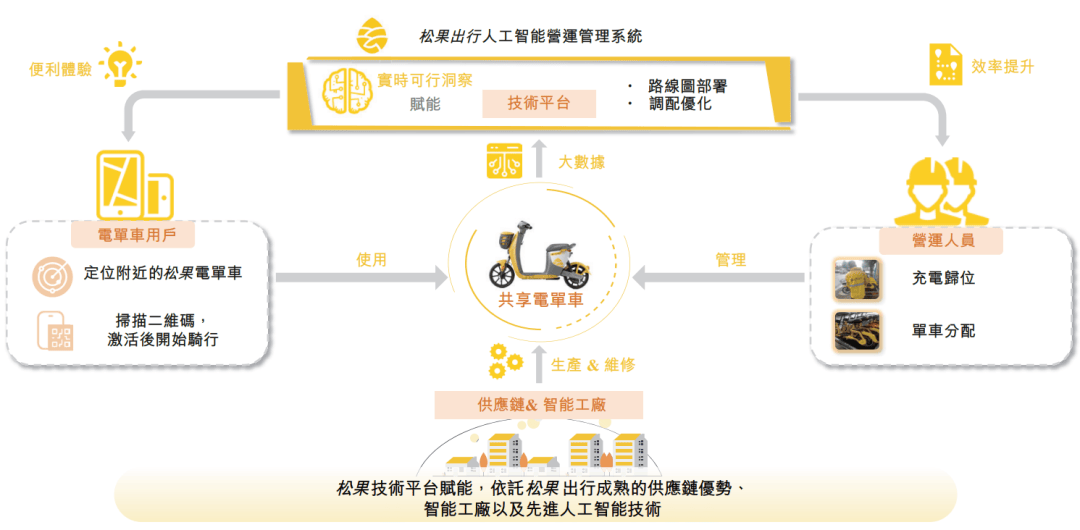 凭借公司的松果人工智能运营管理系统,公司收集来自用户及电单车的数据,包括热门目的地、行驶路线、出行时长、电池容量及维修等,以预测当地居民的出行并确定在特定地点投放的电单车数量。松果动态调配市县内的电单车,以满足用户自发性的出行需求。