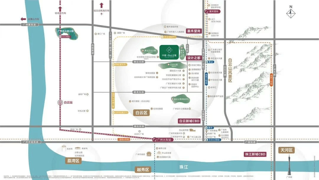 中建白云之星位于白云新城核心板块,该板块是《广州市国土空间总体规划(2021-2035 年)》明确的 “主城西部核心功能区”,定位为集总部经济、高端居住、生态休闲、商业商务于一体的现代化新城,与天河 CBD、琶洲 CBD 并列为广州三大核心增长极。随着白云站 - 白云新城地区详细规划获批,涉宅用地总建面高达 632.32 万㎡,相当于 9 个猎德村旧改规模,区域发展进入快车道。