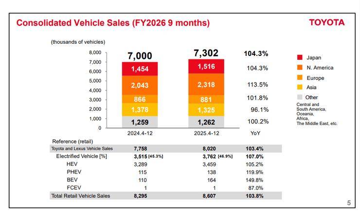 在北美市场出现营业亏损、亚洲销量下滑的背景下,丰田汽车仍将本财年(2025年4月~2026年3月)营业利润预期从3.4万亿日元上调至3.8万亿日元,上调幅度达到近12%。2025年4~12月,日本市场仍为丰田公司最大利润来源,贡献营业利润1.8万亿日元。而亚洲是唯一出现销量下滑的地区。丰田在该地区销售量达到132.5万辆,减少了5.3万辆;营业收入(扣除利率互换带来的估值盈亏影响)减少了353亿日元,降至6454亿日元。但值得注意的是,丰田公司在财报中称,在华业务的营业利润因诸如营销投入和成本削减等因素而有所增长。