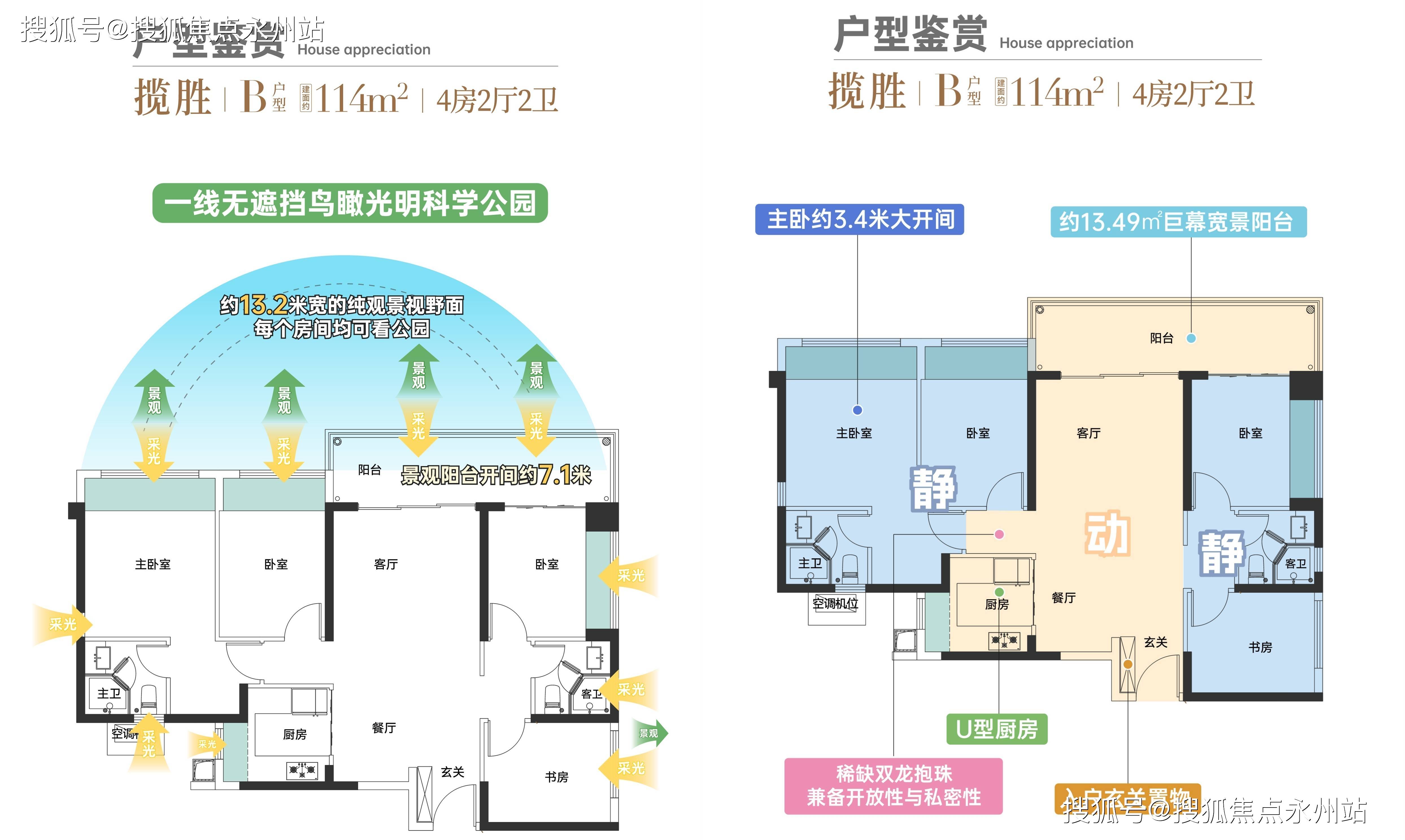 114㎡的4房2厅2卫,设计的是竖厅双龙抱珠格局,进门入户玄关,客厅3.8米的开间,LDKB一体化设计,4个卧室分别做到了主卧17.34㎡/次卧11.07㎡/次卧10.56㎡/次卧9.01㎡(包含墙体飘窗),客厅连接次卧出7米长的观景大阳台,U型厨房,得房率约:81.78%(不含赠送),东北朝向看科学公园。