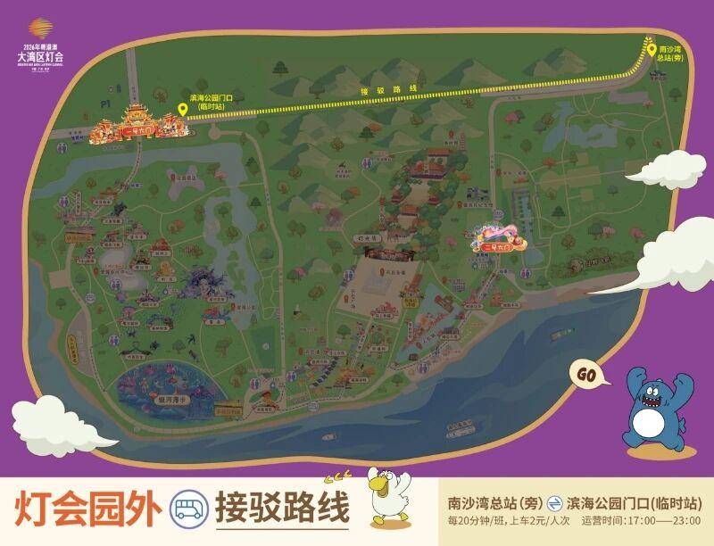 南沙湾公交总站旁(靠近2号门周边停车场)上车点至滨海公园大门口(靠近1号门周边停车场),每二十分钟一班,上车二元,接驳时间17点到23点。