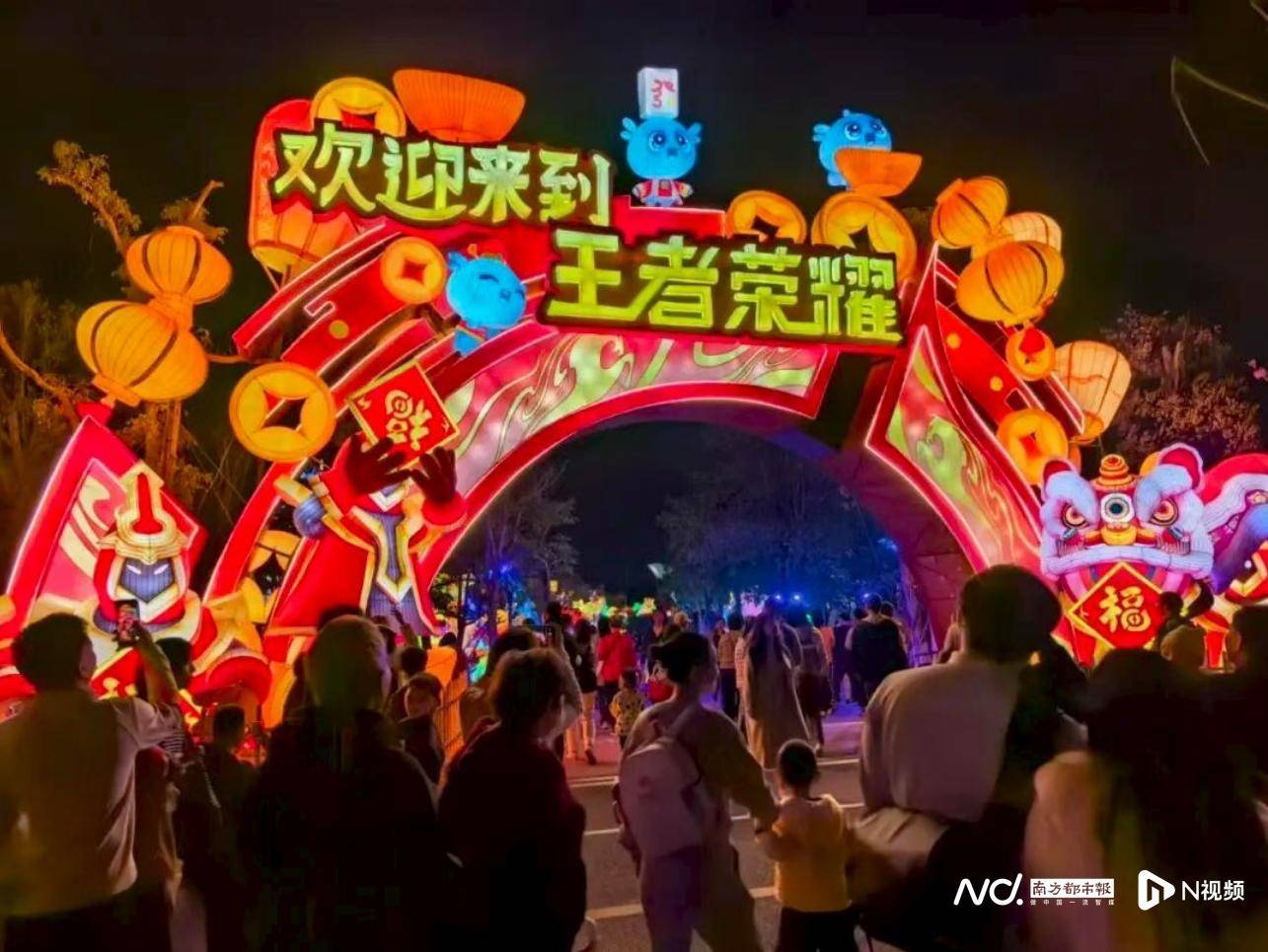 “王者荣耀”系列灯组则是园区内最具人气与辨识度的核心景观之一。灯组以《王者荣耀》英雄“武圣”关羽为核心,鲁班七号、庄周、云缨、蔡文姬、李元芳、梦奇等多位峡谷英雄化身新春福使,惊喜现身为大家送福送喜。