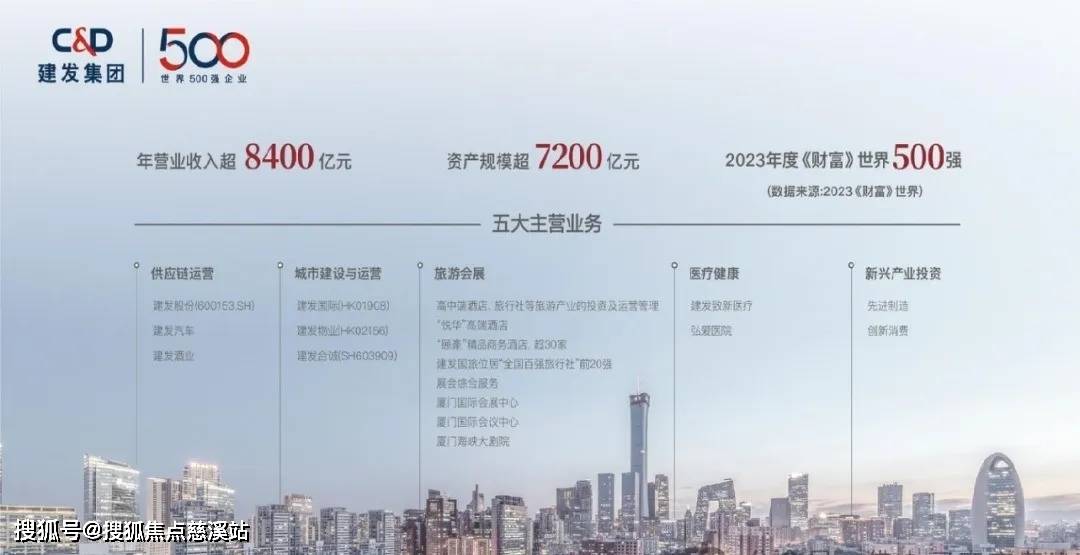 厦门建发集团有限公司成立于1980年,是福建省大型国有投资企业集团。年营业收入超8400亿、资产规模均超7200亿元,排名2023年《财富》世界500强第69位,旗下建发股份位列《财富》中国500强第11位。
