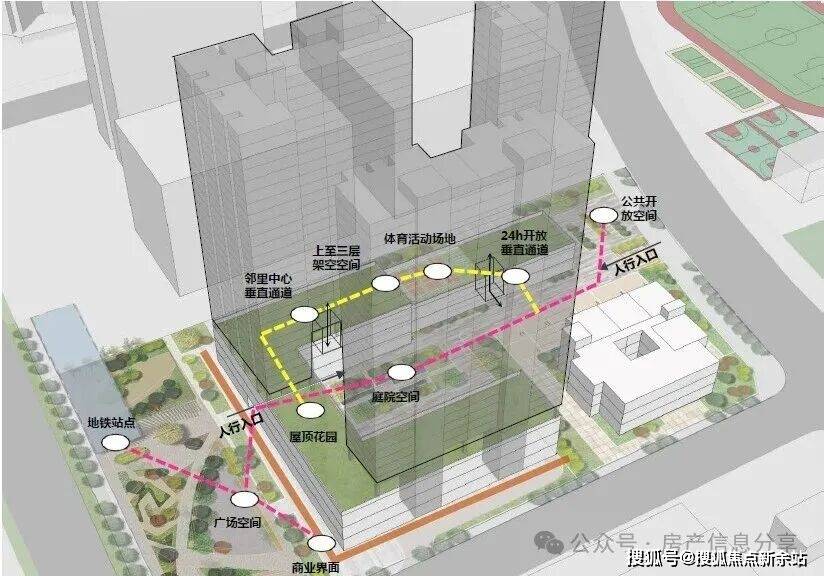 另外,通过打造绿色空间构建地面与空中多层次的立体活动空间,公共空间及垂直交通体系将24小时对市民开放,实现地面空间与裙房屋顶的连通,构建全天候开放式垂直慢行系统。